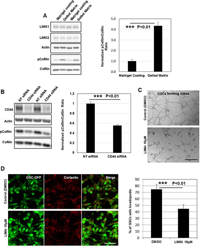 Figure 8: LIMKs activities are upregulated and highly required for GSCs invasive migration during tubes assembly. (A) Cell lysates of GSCs seeded on matrigel-coated or gelled matrix substrates were analyzed by Western blotting and probed for LIMK1, LIMK2, cofilin, pcofilin and Actin. Quantification of the pcofilin/cofilin ratio showed robust up-regulation of LIMKs activities (3-fold) in GSCs forming tubes; ***P < 0.01 (n = 4). (B) Cell lysates of GSCs transfected with NT- or CD44- siRNA were analyzed by Western blotting and probed for CD44, cofilin, pcofilin and Actin. Quantification of the pcofilin/cofilin ratio showed robust down-regulation of LIMKs activities upon CD44 rapid depletion ***P < 0.01 (n = 3). (C) LIMKi addition dramatically impacted on GSCs capacity to form intact tubes. (D) LIMKs inhibition significantly decreased GSCs ability to form invadopodia; ***P < 0.01 (n = 3). All graphs presented as means ± SD. Differences with a probability level P < 0.05 were considered significant in one-way ANOVA. Bars: (C) 100 μm; (D) 50 μm.