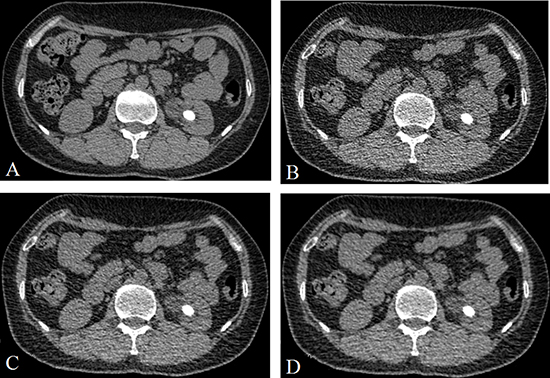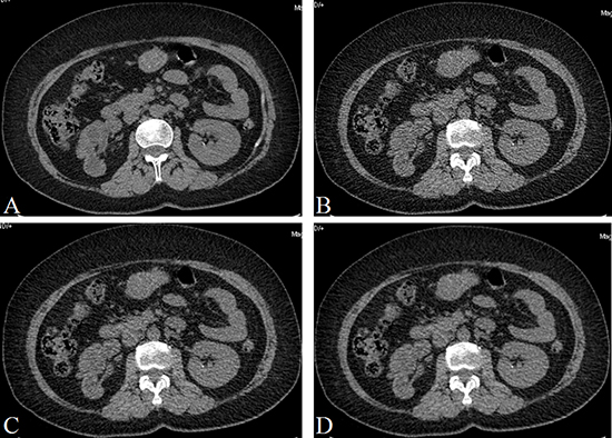 Figure 2: A 71 years old woman with several cyst in the renal. (A) CDCT images, reconstructed with FBP; (B) LDCT image, reconstructed with FBP; (C) LDCT image, reconstructed with 60% ASIR; (D) LDCT images, reconstructed with 80% ASIR. The image quality was poor in B, and the image quality were similar in A and D.