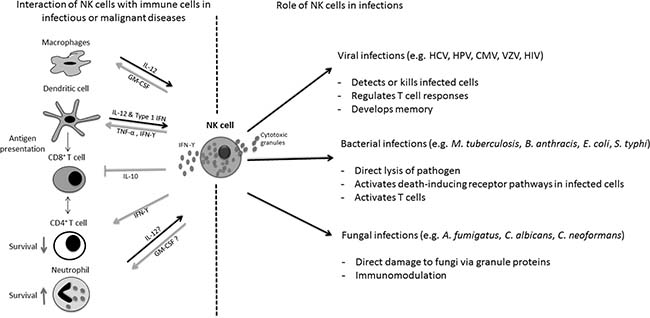 Figure 1: Antimicrobial activities of Natural Killer (NK) cells. NK cells not only detect and damage various viral, bacterial and fungal pathogens (right side), but also modulate proliferation and activation of a variety of cells of the innate and adaptive immune system (left side). IL interleukin; IFN interferon; TNF tumor-necrosis factor; GM-CSF granulocyte-macrophage colony-stimulating factor; HCV hepatitis C virus; HPV human papilloma virus; CMV cytomegalovirus; VZV Varicella-Zoster virus; HIV human immunodeficiency virus.