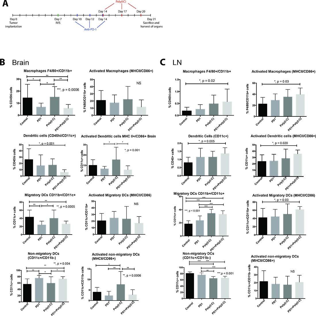 Figure 1: TLR3 agonist enhances activation of dendritic cells (DCs). (A) Treatment schedule. Mice that received an intracranial injection with GL261-luciferase cells were imaged with bioluminescence (IVIS) on day 7 to ensure similar tumor burden in all mice, after IVIS imaging, mice were randomized to each treatment group. Anti-PD-1 treatment was given on days 10, 12, and 14 via intraperitoneal (i.p.) injection. Poly(I:C) was given on days 14, 17, and 20 via i.p. injection. (B–C) Evaluation of macrophage (F4/80+/CD11b+), Dendritic cells (DC, CD11c+), migratory DCs (CD11c+/CD11b+), and non-migratory DCs (CD11c+/CD11b−) and their activation status in the brain (B) and draining lymph node (C). Bar charts show percentage of cells gating on CD45+ and gating on CD45hi in the brain. We observed an increase in the percentage and activation of macrophages and DCs in deep cervical lymph nodes, particularly in the case of migratory DCs. Interestingly, the percentage of macrophages and DCs infiltrating the brain tumor decreased in the anti-PD-1+poly(I:C) group as compared to control mice. Data are represented as mean ± SEM. All experiments repeated in triplicate with ≥5 mice per arm. P-values were determined by ANOVA, and, *denotes statistical significance (p < 0.05).