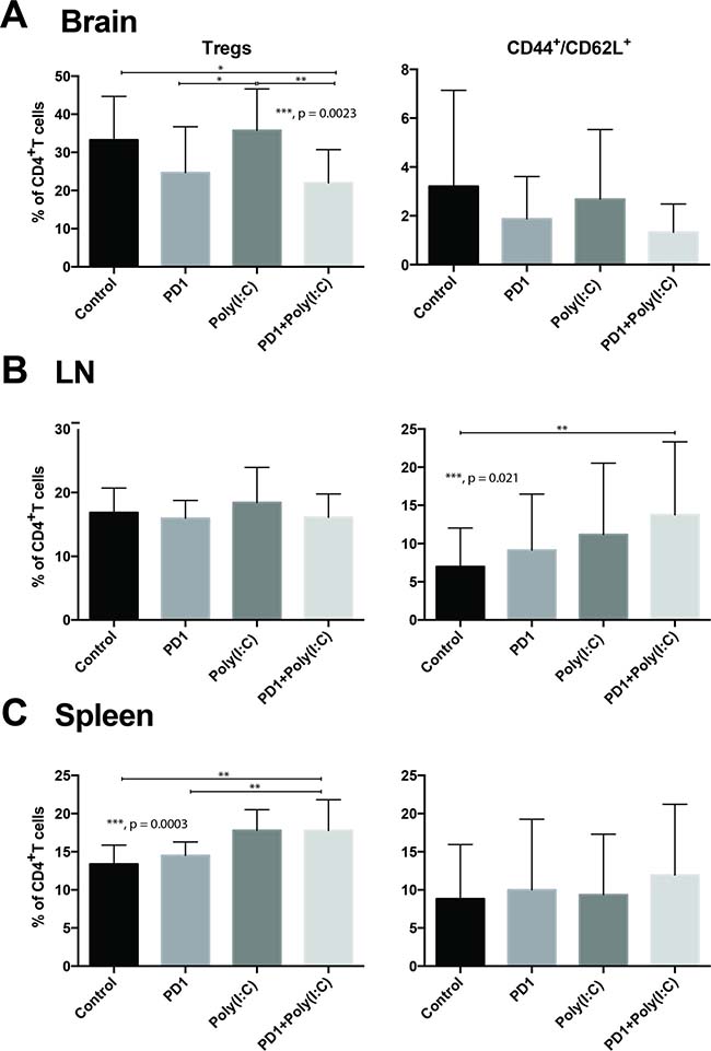 Figure 2: Effect of PD-1 blockade in addition to TLR3 agonist on T cells. Bar charts demonstrating changes in T cell populations in different treatment groups. Anti-PD-1+poly(I:C) decreases percentage of CD4+FoxP3+ Tregs infiltrating the brain tumor and slightly increases infiltration with effector CD8+/CD44+/CD62L– T cells (A). Anti-PD-1+poly(I:C) significantly increases percentage of memory CD8+/CD44+/CD62L+ T cells in lymph nodes (B). Anti-PD-1+poly(I:C) increases the percentage of CD4+FoxP3+ Tregs in the spleen (C). Data are represented as mean ± SEM. All experiments repeated in triplicate with ≥5 mice per arm. P-values were determined by ANOVA, and, *denotes statistical significance (p < 0.05).