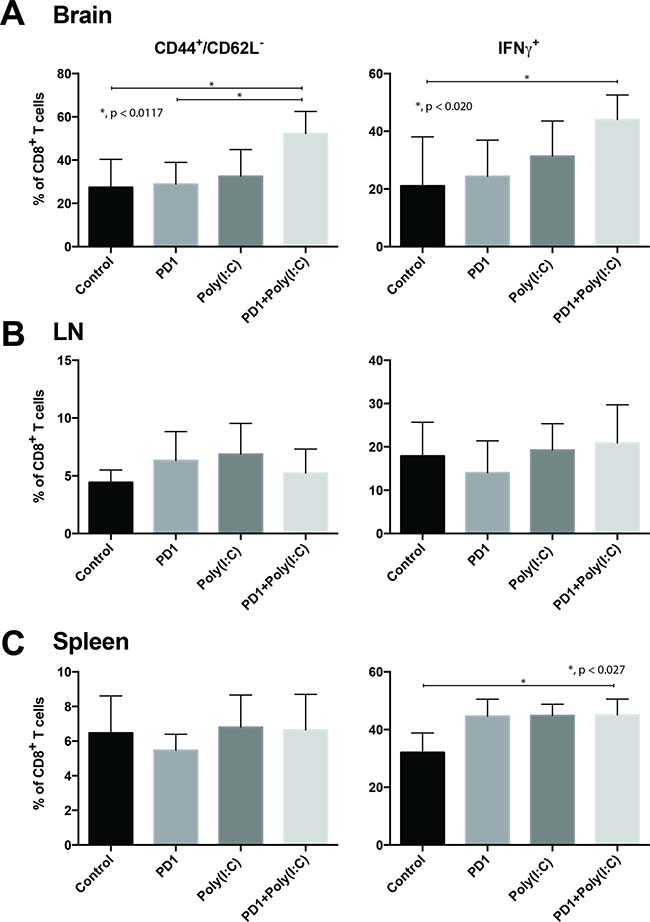 Figure 3: TLR3 agonist combined with PD-1 blockade promotes tumor infiltration of effector CD8+/CD44+/CD62L-/IFN-γ T cells. Bar charts of T cells isolated from tumor bearing brains (A), deep cervical lymph nodes (B), and spleen (C). Charts present expression of CD44, CD62L, and IFN-γ in CD8+ T cells. Data are represented as mean ± SEM. All experiments repeated in triplicate with ≥5 mice per arm. P-values were determined by ANOVA, and, *denotes statistical significance (p < 0.05).