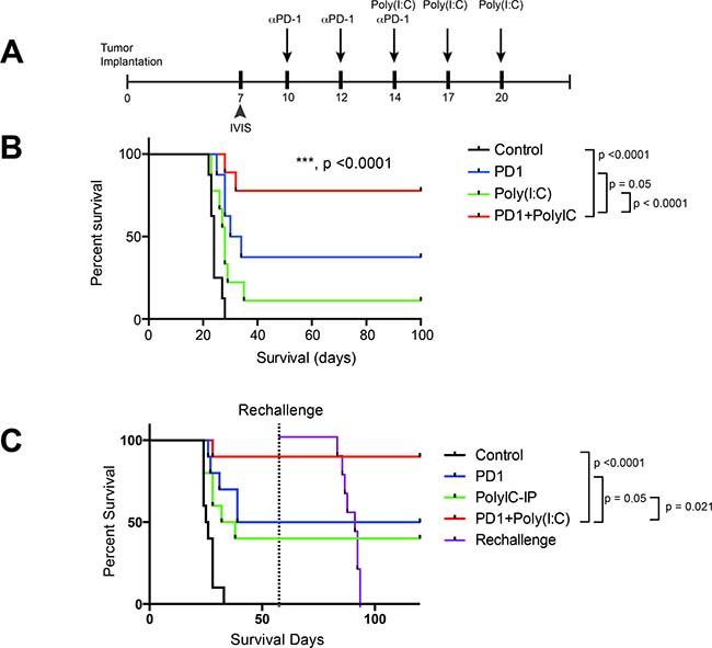 Figure 4: TLR3 activation + anti–PD-1 demonstrates superior survival profile compared to monotherapy regimens. (A) Treatment schedule for survival experiment. (B) anti-PD-1+poly(I:C) treatment provides a significant increase in survival as compared to anti-PD-1 alone (p = 0.05). (C) In a separate experiment the same survival benefit was seen. Long-term survivor mice were rechallenged at day 60 by injecting 260,000 GL261-Luc cells in the cerebral hemisphere contralateral to the initial injection and their survival was tracked along with newly injected control mice. All newly injected control mice developed tumor and died whereas the long-term survivors did not. All experiments repeated in duplicate with ≥10 mice per arm. *denotes statistical significance (p < 0.05) in survival.