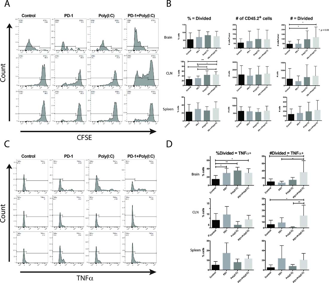 Figure 6: Tumor-specific CD8+ T cells undergo more divisions and produce more TNF-α when mice are treated with anti-PD-1 and Poly(I:C). (A) Representative histograms of CFSE in OT-1 T cells. (B) Summary bar charts showing percentages and numbers of OT-1 T cells undergoing more than 1 division in the brain, lymph node, and spleen. (C) Representative histograms of CFSE labeled OT-1 cells gated on cells undergoing more than 1 division and plotted against production of TNF-α. (D) Summary bar charts showing percentages and numbers of divided OT-1 T cells producing TNF-α in the brain, lymph node, and spleen. Data are represented as mean ± SEM. All experiments repeated in triplicate with ≥5 mice per arm. P-values were determined by ANOVA, and, *denotes statistical significance (p < 0.05).