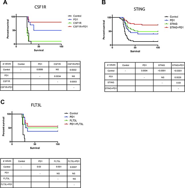 We have tested other agents that activate the innate immune defense such as Sting, which is a TLR-independent pathway of innate defense triggered by nucleic acids. We tested the administration of FLT3L, a key factor in the differentiation of monocytes into dendritic cells [26], and showed that FLT3L administration provides a comparable survival benefit when compared to anti-PD-1, but there is no enhanced survival when FLT3L is administered with PD1. Additionally, anti-CSF-1R antibody was also tested to target tumor-associated macrophages and revert their inhibitory effect on the immune response [27]. CSF1R alone did not have a survival benefit but when combined with anti-PD-1 there was a significant enhancement of the survival benefit. We also tested the effect of STING, a TLR independent mediator of the innate immune response that is activated by cytosolic nucleic acids [28] and when combined with anti-PD-1 there was a significant enhancement in the survival benefit as compared with STING or anti-PD-1 alone (Figure 7). Together, the data from our survival experiments strongly suggests that targeting myeloid cells may be an effective strategy against GBM.