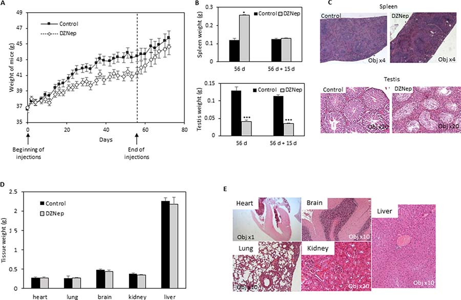 Figure 1: Effect of DZNep on body weight, and tissues of immunocompetent mice. NMRI mice were treated for 8 weeks with DZNep (i.p., 2 mg/kg/days, 3 times a week), then kept alive for two supplemental weeks without injection. Weight of mice were measured regularly during experiment (A). At the end of treatment (B, 56 d, and D) and 15 days later (without supplemental injections) (B, 56 d + 15 d), organs were removed and weighted. Data are expressed as means ± SEM (n = 3). Histological sections with HES staining were performed 15 days after the end of DZNep injections (C and E).