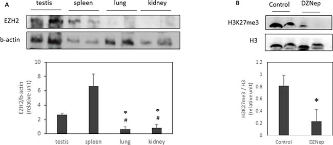 To understand why only some tissues were affected by DZNep, we evaluated EZH2 protein expression. We found that testis and spleen highly expressed EZH2 compared to lung or kidney (Figure 2A). Interestingly, DZNep treatment led a decrease of trimethylation of H3K27 in testis (Figure 2B).