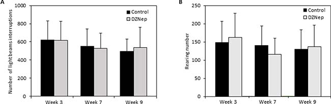 Figure 3: Effect of chronic DZNep injections on spontaneous locomotor activity. Spontaneous locomotor activity was performed 3 and 7 weeks after the beginning of DZNep injections, and 1 week after the end of the treatment (week 9). The number of light beam interruptions (A) and of rearing (B) was evaluated in DZNep treated and control mice. Data are expressed as means ± SEM (n = 18).