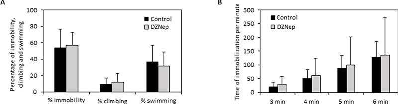 In the forced swimming test, there was no significant difference on immobility, climbing and swimming percentages between DZNep-treated and control animals (Figure 7A). Furthermore, DZNep had no effect on time of immobilization per minute (Figure 7B). These data reveal that DZNep treatment did not affect depressive-like behavior.