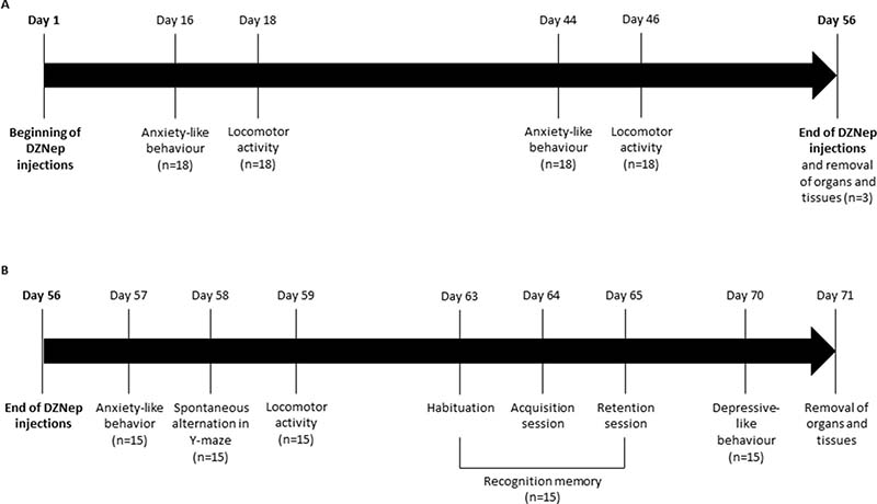 Figure 8: Experimental design. NMRI mice were treated for 8 weeks (56 days) with DZNep (i.p., 2 mg/kg, 3 times per week) (n = 18/group) (A). Anxiety-like behavior and locomotor activity were assessed at weeks 2 and 6. At week 8 (e.g. at the end of treatment), organs and tissues were removed for three mice/group. For other animals (n = 15/group), mice were kept alive during two additional weeks without injections (B). Anxiety-like behavior, spontaneous alternation in Y-maze and locomotor activity were performed one, two and three days after the end of treatments (day 57, 58 and 59) respectively. Recognition memory was assessed one week after the end of treatment, during 3 days with different sessions (day 63: habituation session, day 64: acquisition session and day 65: retention session). Finally, depressive-like behavior was performed two weeks after the end of treatment (day 70). Organs and tissues were removed the next day.