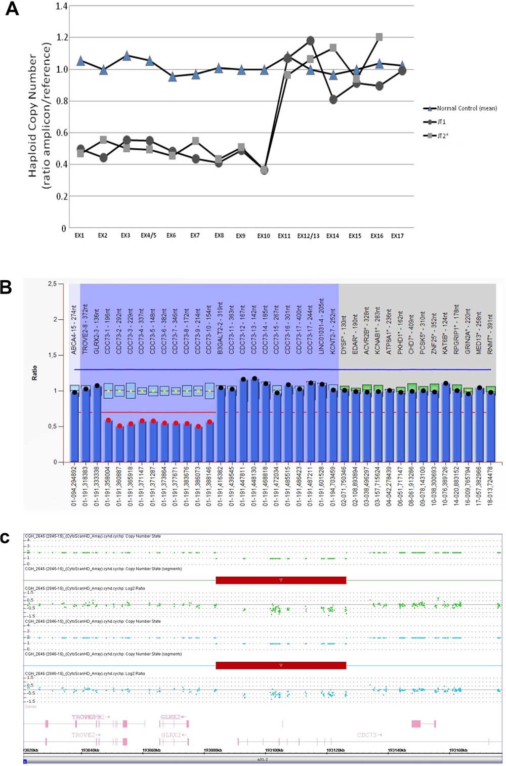 Partial deletion of the CDC73 gene and the hemizygous status in 1 HPT-JT patient (JT2) was detected. The deletion involved the first 10 exons and was confirmed by MLPA and aCGH methodology with the following breakpoints: left breakpoint 193,083,733 –193,083,949 and the right breakpoint 193,126,404–193,126,441 (Figure 1A–1C, respectively). The analysis was then extended to the whole family and the deletion confirmed on all the living affected members and in some unaffected carriers.