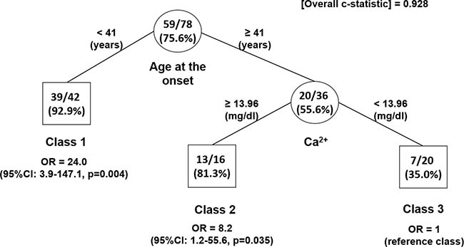 As shown in Figure 4, whenever AaO assumes values < 41.5 years, it achieved the highest discriminatory ability, independently from the levels of Ca2+ as it was able to discriminate subjects with the highest likelihood of having a CDC73 lesion (OR = 27.1, 95% CI: 4.3–172.0, p = 0.004 in respect to the reference class). On the other hand, among subjects with AaO ≥ 41.5 ys, the levels of Ca2+ represented the secondary important predictive variable as it plays a determinant role in the splitting process (at this step only), because it would be able to discriminate subjects with a higher likelihood of having a CDC73 lesion (i.e. Ca2+ ≥ 13.96 mg/dL, OR = 10.6, 95% CI: 1.6–72.4, p = 0.022) compared to those with the lowest likelihood of having such a CDC73 lesion (i.e. Ca2+< 13.96 mg/dl i.e. the reference class).