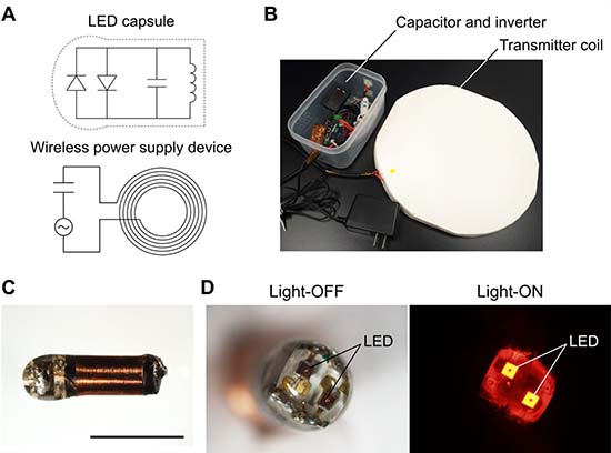 Figure 1: Implantable NIR-LED system. (A) Circuit diagram of the wireless power supply device and the LED capsule. (B) Photograph of the wireless power supply device. The inner and outer diameters of the transmitter coil were 150 mm and 300 mm, respectively. (C) LED capsule. The length is about 7 mm. A copper wire was winded around a cylindrical ferrite by approximately 30 turns. The LED capsule was coated with biocompatible transparent epoxy resin. Scale bar: 5 mm. (D) Two LEDs at the head of the capsule in light-ON (680-700 nm) and light-OFF state.