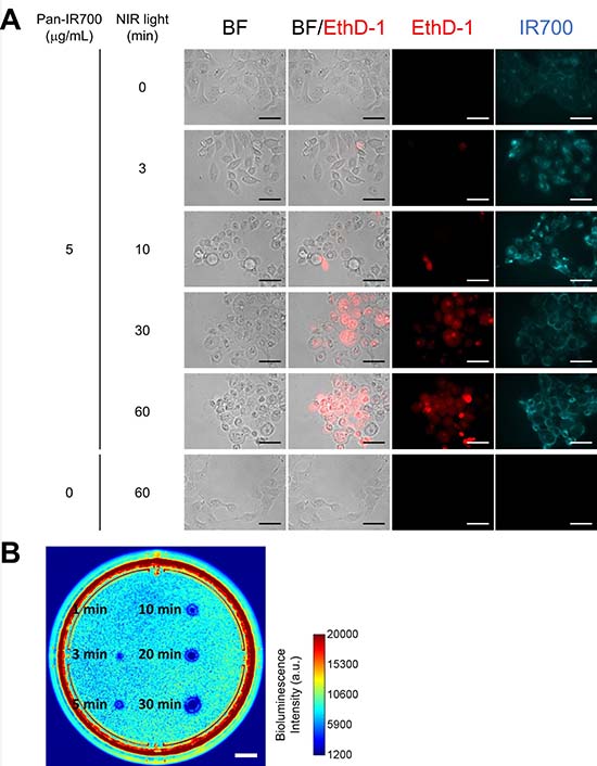 Figure 2: In vitro NIR-PIT for A431-GFP-luc cells. (A) Phase and fluorescent microscopy of NIR-PIT treated A431-GFP-luc cells, which were pre-incubated with Pan-IR700 (5 μg/mL) at 37° C for 1 h. NIR-PIT induced cell death with cell swelling and bleb formation. EthD-1 staining showed cell death in a light dose-dependent manner. Scale bar: 50 μm (original magnification, 40×). (B) Bioluminescence imaging of a 10 cm dish demonstrated that luciferase activity in A431-GFP-luc cells decreased with increasing light dose. Scale bar: 1 cm.