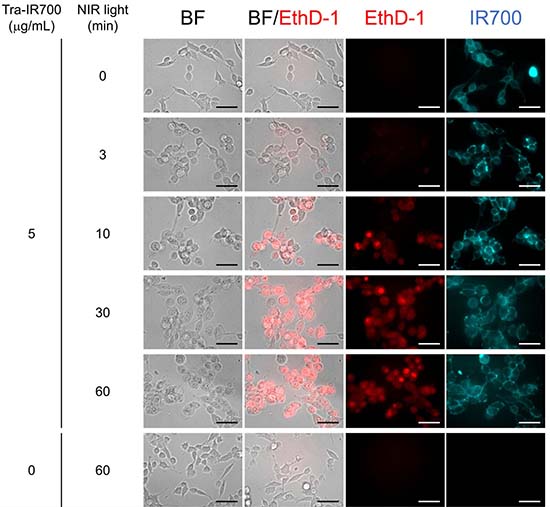 Figure 3: In vitro NIR-PIT for 3T3-HER2 cells. Phase and fluorescent microscopy of NIR-PIT treated 3T3-HER2 cells, which were pre-incubated with Tra-IR700 at 37° C for 1 h. NIR-PIT induced cell swelling and bleb formation. The severity of cell damage and the uptake of EthD-1 increased with increasing light dose. Scale bar: 50 μm (original magnification, 40×).