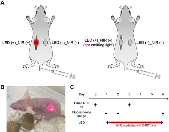 Figure 4: In vivo NIR-PIT in mice: setup. (A) Schematic of tumor-bearing LEDs implanted mice. Treated mice (left): NIR-LED (LED (+)_NIR (+)) was implanted in one tumor and no LED in the other tumor (LED (−)_NIR (−)). Non-treated mice (right): dummy LED (LED (+)_NIR (−)) was implanted in a tumor and no LED in the other tumor (LED (−)_NIR (−)). (B) Photograph of a treated mouse implanted with the wireless LED. (C) Treatment and imaging schedule.