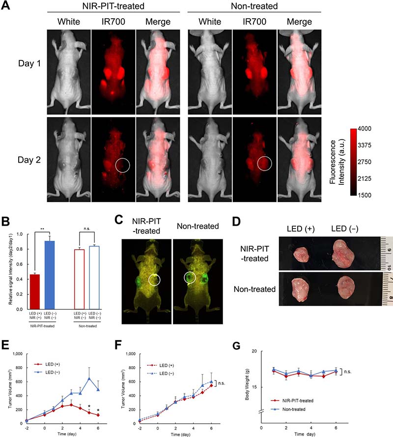 Figure 5: In vivo NIR-PIT in mice: results. (A) IR700 fluorescence images on day 1 (top) and day 2 (bottom) of treated (left) and non-treated (right) mice. White circles indicate the NIR-LED in treated mice and the dummy LED in non-treated mice. (B) The relative signal intensity (day2/day1) of IR700 on LED (+)_NIR (+) tumor in treated mice was significantly lower than in tumors with no LED whereas no significant difference in relative signal intensity between the dummy LED (LED (+)_NIR (−)) tumor and the tumor with no LED was detected in non-treated mice (n = 6 treated mice, n = 3 non-treated mice) (**p < 0.01). (C) GFP fluorescence imaging on day 6 showed that the intensity in LED (+)_NIR (+) tumors in treated mice was lower than in (LED (+)_NIR (−)) tumors in non-treated mice. (D) Ex vivo images of tumors in treated (top) and non-treated (bottom) mice, showing reduced tumor size in NIR-LED exposed tumors compared to dummy LED and to tumors with no LED. (E) Tumor volume as a function of time in LED (+)_NIR (+) tumors and LED (−)_NIR (−) tumors in treated mice. The chart shows that tumor growth was suppressed in LED (+)_NIR (+) tumors (n = 6 treated mice). The differences between LED (+)_NIR (+) and LED (−)_NIR (−) tumors were statistically significant on day 5 and 6 (*p = 0.011, p = 0.010, respectively). (F) Tumor volume as a function of time in LED (+)_NIR (−) tumors and LED (−)_NIR (−) tumors in non-treated mice. No significant difference in volume was observed between the two tumors in non-treated mice (n = 3 non-treated mice). (G) Body weight as a function of time in treated and non-treated mice. The chart shows that body weights did not change during experiments in neither group (n = 6 treated mice, n = 3 non-treated mice).