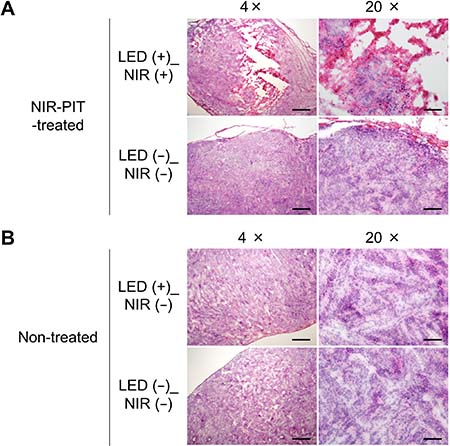 Figure 6: Histological analysis of NIR-PIT effects. (A) Treated mice: tumor cells were significantly damaged in the LED (+)_NIR (+) tumor (top), whereas no apparent damage was observed in LED (−)_NIR (−) tumors (bottom). (B) Non-treated mice: no apparent cell damage was observed, neither in LED (+)_NIR (−) (top) nor in LED (−)_NIR (−) tumors (bottom). Scale bar: 500 μm in 4× images. Scale bar: 100 μm in 20× images.