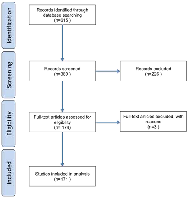 For bibliometric analysis the PubMed database was queried using the “trial AND (pancreas OR pancreatic) AND (cancer OR tumor OR adenocarcinoma) AND (unresectable OR advanced OR metastatic)” search term, specifying publication dates from 2014/01/01 to 2016/12/31 to identify relevant articles published since 2014. Figure 1 provides a flowchart showing how bibliometric information was processed during the course of systematic review. Of the 615 identified articles, reviews, case-studies, sub-group analyses and meta-analyses were excluded. Reports that did not explore therapeutic strategies for the purpose of treating unresectable pancreatic ductal adenocarcinomas, i.e. ultimately increasing overall survival (OS) of patients, were also excluded, leaving 171 relevant articles. This included first-line and second-line studies, and dose-finding studies performed in patients presenting with a broad grouping of advanced solid tumors as long as pancreatic cancer patients were included. Studies that primarily investigated prophylactic treatments were excluded. Phase I trials investigating therapeutics in multiple advanced solid tumor types were included in this systematic review but survival data was only used if pancreatic cancer data was reported. Citation data was retrieved from Web of Science.
