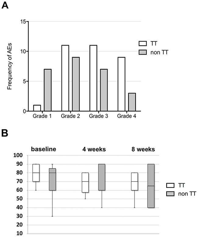 Within the small group adverse events were not significantly different in both groups. The QOL of those patients as assessed by Karnofsky/Lansky score was not affected by the targeted therapy making it a feasible therapy option in refractory cases.