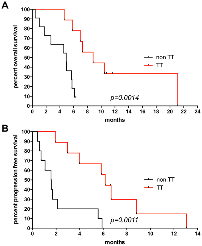 Nine patients received targeted therapy (TT) based on gene expression analysis of tumor tissues while in eleven patients no targeted therapy was administered (non TT). Reasons for precluding patients from TT are detailed as follows: Severe sepsis developed in PT11 precluding other therapy potentially interfering with the immune response. Targeted therapy was not administered due to patient preference in patients 11, 13, 14, 18, 19 and 20. PT15 suffered from difficulty swallowing and was not able to receive oral therapy and received palliative care according to standard as described. In PT16 targeted therapy was not given due to family’s choice, instead the patient received 17 doses of Mifamurtid (2mg/m2) and best palliative care. Due to his HLA-type PT17 was eligible for an immunotherapy protocol with tumor specific T-cells and preferred this therapy. In PT12 chemotherapy with two cycles of trabectidin/irinotecan [7] was preferred over targeted therapy (physician’s choice). Survival after start of this therapy was four months. Target analysis could not be performed on the first biopsy of PT10 due to RNA degradation and by the time material from a repeated biopsy revealed targets, the patient had passed away. Targeted therapy was given as compassionate use in all patients.