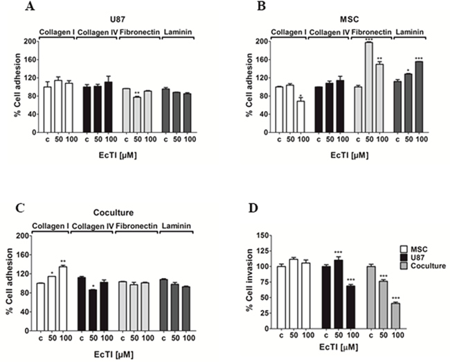 Figure 3: Effects of EcTI on cell adhesion and invasion. EcTI in 50 and 100 μM differentially affects the adhesion of U87 (A); MSC (B); and coculture (C) coated with collagen I, collagen IV, laminin, and fibronectin. The absorbance values measured at 540 nm were normalized to control non-treated cells (c). EcTI effects on the invasion of mono-cultured GBM U87 cells, MSCs, and cocultured (D) were measured in Boyden chambers. Error bars represent SD (*p < 0.05, **p< 0.005, ***p< 0.0005).