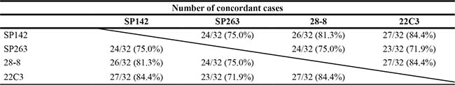 The concordance rate between each assay is shown in Table 3. The concordance rates between SP142 and 22C3 and between 28–8 and 22C3 were the highest at 84.4%, followed by 81.3% between SP142 and 28–8. The concordance rates between SP263 and each assay were low (71.9% to 75.0%).