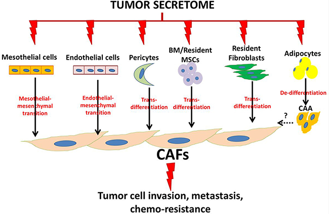 Figure 2: Schematic illustration of ovarian cancer cell-induced phenotypic commitment of stromal cells into cancer-associated phenotype. CAFs: cancer-associated fibroblasts, CAA: cancer-associated adipocytes, BM: bone marrow, MSCs: mesenchymal stem cells.