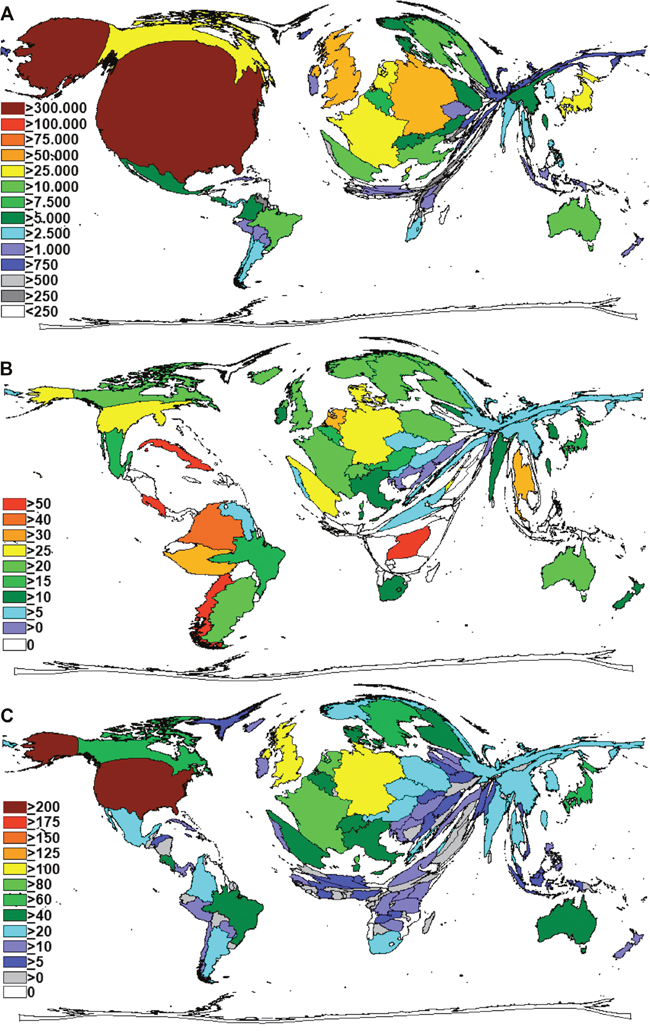Figure 2: Density equalizing maps projections. (A) Total number of HPV-specific citations per country. (B) Levels of HPV-specific citation rates of countries (threshold 30 publications). (C) Levels of HPV-specific h-indices of countries.