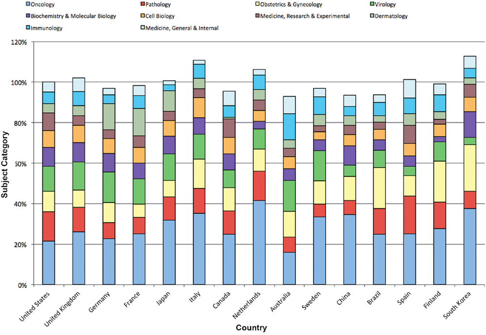 After retrieval of metadata of all HPV-related publications, bibliographic details were sorted and analyzed according to a number of criteria. These included the countries of origin, languages, document types, citations, cited references, year published and subject categories for all HPV-related publications. From these metadata, HPV research-specific modified country h-indices were calculated. This index was developed by Jorge Hirsch in 2005 for an assessment of the scientific quality of all items a specific author contributed to the field [49]. Here, we applied the concept to evaluate the output of single countries specifically regarding HPV research and therefore termed the parameter “modified h-index”.