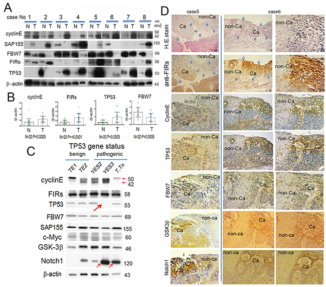 Figure 1: FBW7 was significantly decreased whereas FIRs, cyclin E and TP53 were significantly increased in esophageal cancer tissues indicated by Western blot analysis. (A) Western blot analysis of cyclin E, SAP155, FBW7, FIRs, and TP53 expression in esophageal cancer tissue (T) and non-cancer tissues (N) without chemoradiation therapy before operation. β-actin was used as internal control. Cyclin E, FIRs, and TP53 were significantly increased in cancer tissues than in non-cancer tissues. On the other hand, FBW7 expression was significantly decreased in cancer tissue. Note, in case 2, TP53 was paradoxically highly expressed in (N) than that of (T). (B) Histogram of protein expression between cancer and non-cancer tissues. The ratio of qRT-PCR results were cyclin E (T/N)=2.0, FIRs (T/N)=2.6, TP53 (T/N)=3.3 and FBW7 (T/N)=0.54. Statistical analysis was performed by t-test. P values < 0.05 were considered significant. (C) Correlation of T/N ration between TP53 and FBW7 was indicated. There was weak negative correlation between TP53 (T/N) and FBW7 (T/N). (D) Cyclin E, FIRs, TP53, FBW7, SAP155, c-Myc, GSK-3β, and Notch1 expression were indicated depending on the TP53 mutational status. β-actin was used as an internal endogenous control. TP53 variation status was benign in HeLa, TE1 and TE2 whereas pathogenic in YES, YES3 and T.Tn. The TP53 was truncated in YES3 cells (thick arrow). Cyclin E was less expressed whereas Notch 1 was increased in YES3 and T.Tn, than those of benign cells (thin arrows). FIR, cyclin E, TP53, FBW7, GSK-3β, Notch1 expression and H&E staining was performed by immunohistochemical staining in esophageal cancer (Ca) and corresponding non-cancer tissues (non-Ca).