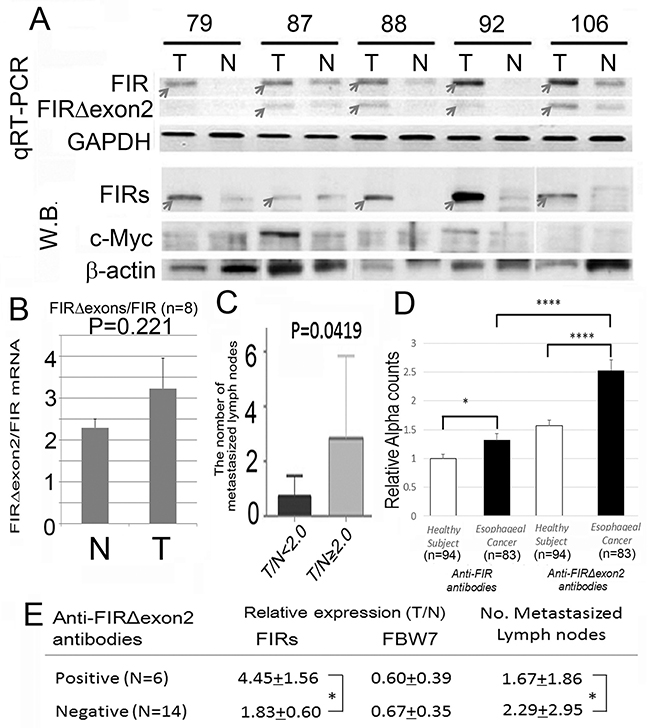 Figure 2: Alternatively spliced form of FIR (FIRΔexon2) was expressed in ESCC tissues and anti-FIRΔexon2 autoantibodies were detected in the serum of the patients. (A) The expression levels of FIRΔexon2 and FIR mRNA in esophageal cancer (T) and corresponding non-cancer tissues (N) were examined by qRT-PCR and Western blot. Both FIR and FIRΔexon2 mRNAs were higher in cancer tissue than in non-cancer tissues. (B) The ratio of FIRΔexon2/FIR mRNA expression was higher in esophageal cancer tissues (T: 3.23 in average) than in non-cancer tissues (N: 2.29 in average) without statistical significance (t-test, P=0.221). Note, c-Myc expression showed no significant difference between esophageal cancer and non-cancer tissue examined in this experiment. (C) The degree of expression of FIRs was correlated positively with the number of metastasized lymph nodes. In serum of esophageal cancer patients, anti-FIRΔexon2 autoantibodies were detected compared to FIR. (D) Relative anti-FIR or anti-FIRΔexon2 antibodies detected in the sera of esophageal cancer patients. (E) Anti-FIRΔexon2 autoantibodies, FIRs, and FBW7 expression in cancer tissues. The average of the number of lymph nodes metastasis was significantly smaller in positive cases (N=6, 1.67+1.86) than in negative cases (N=14, 2.29+2.95) in terms of anti-FIRΔexon2 autoantibodies detection. P-values were calculated by Student’s t-test. *P<0.05, ****P<0.0001. Error bars indicated standard error. Esophageal cancer tissue (T) and non-cancer tissues (N) were examined without chemoradiation therapy before operation.