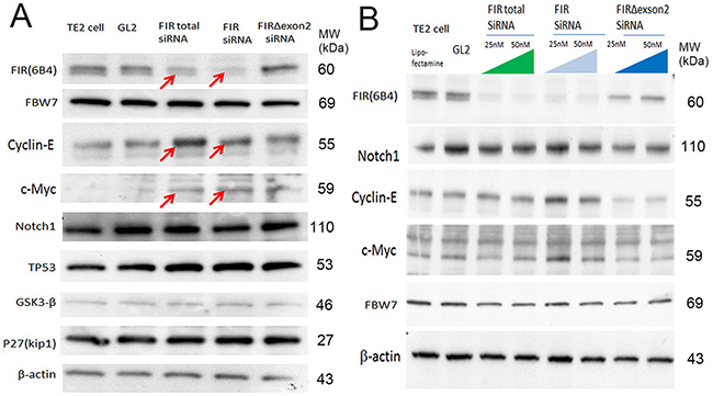 Figure 3: FIRΔexon2 was required for cyclin E expression in ESCC cells. (A) The effect byFIRs, FIR andΔexon2 siRNA to FBW7, cyclin E, c-Myc, Notch1, TP53, GSK3-β and P27(Kip1) were examined in TE2 cells (benign TP53). (B) Total FIR and FIR siRNA increased cyclin E in ESCC cells (TE2 cells) in a dose dependent manner. FIRΔexon2 siRNA suppressed cyclin E expression in ESCC cells.