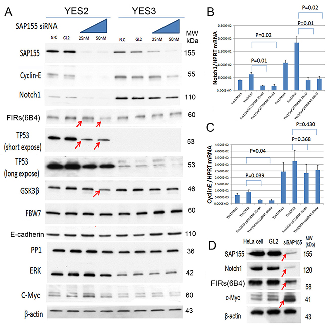 Figure 4: SAP155 (SF3b1) was required for cyclin E and Notch 1 mRNA expression in ESCC cells. SAP155 (SF3b1) siRNA suppressed cyclin E, TP53, Notch 1, FIRs, TP53, GSK3β, FBW7, E-cadherin, PP1, ERK and c-Myc expression in esophageal cancer cells, YES2 and YES3. (A) SAP155 siRNA decreased cyclin E, Notch1 FIRs and TP53 expression in YES2 (pathogenic TP53), but observed less effective in YES3 cells (truncated TP53 expression). FBW7 expression was irrelevant to SAP155 siRNA in YES2 and YES3 cells. Note, GSK3-β was suppressed by SAP155 siRNA in YES2 cells. FBW7, E-cadherin, PP1, ERK and c-Myc were not affected by SAP155 siRNA in YES2 and YES3 cells. (B) qRT-PCR of Notch1 mRNAby SAP155 siRNAin YES2 and YES3. (C) qRT-PCR of cyclin E mRNA by SAP155 siRNAin YES2 and YES3. (D) SAP155 siRNA decreased Notch1 and TP53 expression in HeLa cells (benign TP53).