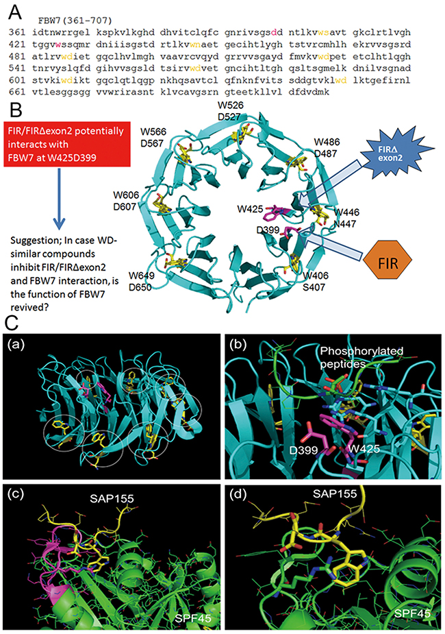 Figure 5: Potential interaction between FBW7 and FIR/FIRΔexon2 revealed by computational three-dimensional crystal structural analysis. Three-dimensional crystal structural analysis of FBW7 revealed that Trp (W) and Asp (D) were located next to each other in its degron pocket as a WD domain-like structure that possibly bound to the UHM-domain in the carboxyl-terminus of FIR. (A) Amino acids sequence (aa. 361–707) of substrate binding site is indicated. CPD bond propeller pocket in FBW7 also is known as the “degron pocket.” Neighboring W and D (indicated in yellow) potentially binds to FIR-UHM (see text). (B) All neighboring WD domain (indicated in yellow) formed the structural backbone of the “degron pocket” of FBW7. Interestingly, WD-like motifs (W425 and D399) of the “degron pocket” are closely located to each other in 3D structure after protein folding, and it has been suggested that they interact with FIR-UHM (LNGRWFAGRKVVA) (indicated in magenta). (C-a) Structure of CPD of FBW7. WD motifs to stabilize the CPD folding are colored yellow and indicated by circles. W and D residues colored magenta are not involved in the CPD folding. (C-b) Binding of a phosphorylated peptide to CPD. The phosphate group makes an interaction with three R residues shown by the stick representation. The W and D residues not involved in the CPD folding are positioned at the middle of CPD. (C-c) Interaction of SAP155 and SPF45. The LNGRYFGGRVVKA motif of SPF45 is colored magenta. (C-d) Close view of the SAP155-SPF45 interaction. W and D residues of SAP155 shown in yellow made a strong interaction with R304 of SPF45, depicted in the stick representation.