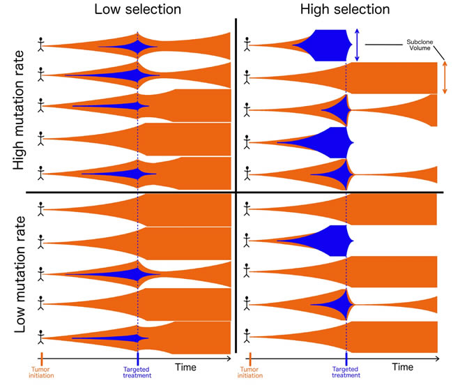 Figure 1: Tumor evolution and treatment under high and low mutation and high and low selection scenarios. Each tumor is initiated by an original cell population (orange), and populations expand in size (vertical axis) over time (horizontal axis). As the tumor grows, a new subclone (blue) can be founded via a mutation that confers a more extensive cancer phenotype, and can grow alongside or supplant the original population. Targeted treatment (blue line) specifically eliminates the new population that it targets (blue), leading to a varying consequence on the tumor that depends on the extent of intra-tumor heterogeneity, which is determined by its selective effect. Tumors with a high proportion of their cells belonging to the population affected by treatment are most likely to experience the greatest reduction of tumor burden, the longest remission before recurrence, and the greatest opportunity for cure.