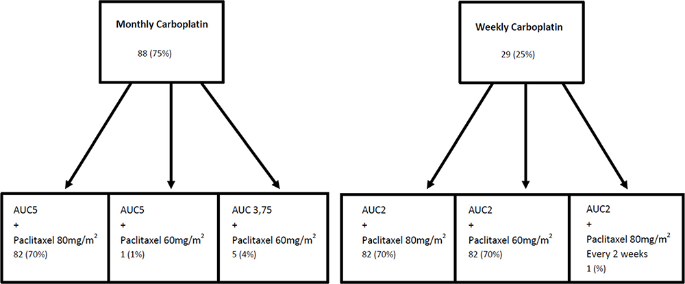 Different 28-days schedules were used. Paclitaxel was administered at 80 mg/m2 at day 1 (D1), day 8 (D8) and day 15 (D15). The standard schedule was Carboplatin AUC5 (area under the curve = 5) at D1 and in the alternative schedule Carboplatin was administered at AUC2 at D1, D8 and D15.
