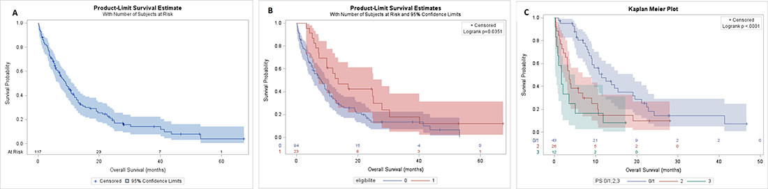 Figure 2: OS of population. OS of all population (A), in eligible and no eligible group (B), in PS 0/1, 2 and 3 of no eligible group (C).