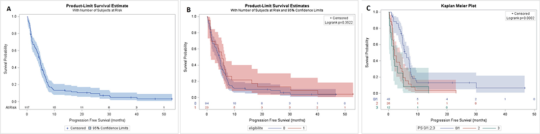 Figure 3: PFS of population. PFS of all population (A), in eligible and no eligible group (B), in PS 0/1, 2 and 3 of no eligible group (C).