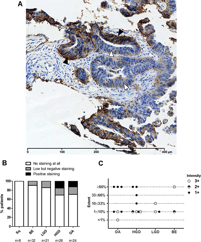 Figure 1: Heterogeneous HER2 immunohistochemistry in the progression to OA. (A) An example of heterogeneous HER2 staining in HER2 positive invasive OA with areas of strong immunohistochemical HER2 positivity (black arrows), borderline staining (grey arrows) and HER2 negativity (white arrows). (B) HER2 expression evaluated by IHC in oesophageal adenocarcinomas and gastroesophageal junction adenocarcinomas (GOJ) as per EMEA guidelines. HER2 positivity defined as immunohistochemistry (IHC) scores of 3+ or 2+ with confirmatory in-situ hybridisation (ISH). ISH positivity defined as HER2:CEP17 ratio of ≥2; ratio <2 defining negative ISH. Borderline negative cases were categorised as those showing some HER2 staining but not sufficient to score positively. (C) Inset table detailing distribution of HER2 staining in oesophageal and gastroesophageal adenocarcinomas, with 2+ IHC cases subdivided by ISH status.