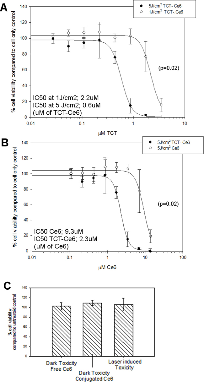 Figure 3: Dose and light dependent PDT cytotoxicity of the TCT-Ce6 compared to free drug on HER2 positive oesophageal cells (OE19). (A) The IC50 TCT-Ce6 at 5J/cm2 was 0.6 μΜ, with five times less light it was 2.2 μM (curves significantly different p = 0.02). (B) Comparable cytotoxicity of free Ce6 compared to conjugated Ce6. TCT-Ce6 was significantly more cytotoxic than equivalent amounts of Ce6. (C) Controls show no toxicity of TCT-Ce6 without light or from the laser alone. All experiments underwent the same PDT treatment; cells were exposed to various concentrations of the drug over one hour at 37° C, cells are then washed twice prior to exposing cells to a 670 nm laser. Cell viability was measured 24 hours later via MTT assay. The data shown is representative of at 6 independent repeats with various batches of drug.