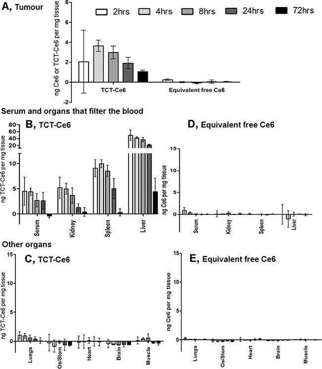 Figure 4: Tissue distribution of TCT-Ce6 at various timepoints after I.V injection. (A) Distribution of TCT-Ce6 conjugate or free Ce6 into the tumour at 2, 4, 8, 24 or 72 hours after I.V injection into the tail vein (n = 3 at each time point). Mean data ± SEM. TCT-Ce6 accumulation in the tumour peaks at 4 hours. TCT-Ce6 (B, C) or equivalent Ce6 (D, E) distribution in the serum and other organs. Ce6 specific fluorescence measured in dissolved tissue, results controlled for tissue specific auto-fluorescence and quenching with standard curves of either free or conjugated Ce6 dissolved in each tissue (Supplementary Figure 7) as well as the lower fluorescent efficiency of the Ce6 once conjugated (~20% of free Ce6).
