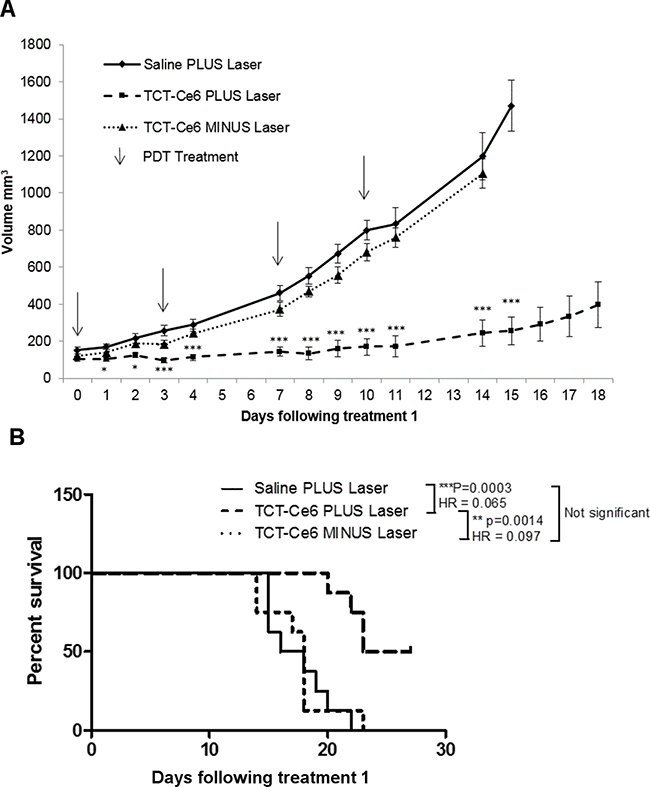 Eleven days after tumour implantation 24 SCID mice were assigned to treatment groups: Saline (n = 8), TCT-Ce6 plus laser (n = 8) and TCT-Ce6 minus laser (n = 8). Mice were treated with 0.2 ml of either saline or TCT-Ce6 (0.5 mg/ml) injections (i.v.). Four hours following treatment a 2 cm diameter spot covering the tumour was illuminated using a 200 J/cm2 laser dose (150 mW/cm2 over 22 min 11sec). Laser power was kept at or below 150mW/cm2 to prevent tissue heating. The rest of the mouse was covered with a black cloth to limit illumination of normal tissue, and the room was maintained in dim light. TCT-Ce6 plus laser and saline treatment groups received laser illumination, while TCT-Ce6 minus laser mice received the equivalent duration of anaesthesia only. Mice were treated twice a week for 2 weeks (days 11, 14, 18, 21 following tumour inoculation) and kept under slightly subdued-lighting conditions throughout treatment and the following day. Animals were observed and tumours measured 3 times a week until experimental end point up to 40 days after tumour inoculation. For the small study featured in (Supplementary Figure 9C) the protocol was exactly the same apart from either the equivalent amount of free Ce6 (0.1 ml 0.08 mg/ml) (n = 2) or 0.1ml saline (n = 2) was injected (i.v.) at each treatment point. One-way ANOVA with Bonferroni’s post-hoc multiple comparison tests was used to determine significant differences in tumour volume between groups using the SPSS program (IBM Corp. Armonk, NY). Kaplan-Meier survival curves were plotted and regression model multivariate analysis was carried out using Cox’s proportional hazards model (Log-rank Mantel-Cox Test) (GraphPad PRISM Software, San Diego, CA) [51].