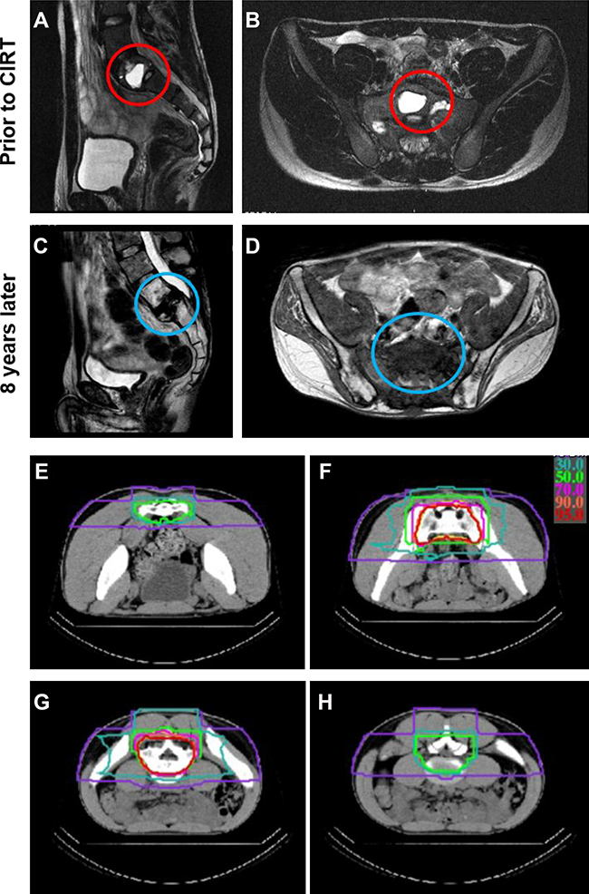 Figure 1: An example of a treated case with unresectable sacral (S1) osteosarcoma. (A–B) show magnetic resonance imaging (MRI) scans prior to carbon ion radiotherapy (CIRT) in the sagittal (A) and horizontal (B) planes with the tumor highlighted in the red circles. (C–D) show MRI scans 8 years after CIRT in the sagittal (C) and horizontal (D) planes without any tumor recurrence (blue circles) but with obvious fracture in S1. (E–H) show selected computed tomography (CT) cross sectional views of the CIRT dose distribution (isodose lines: red 95%, orange 90%, pink 70%, light green 50%, green 30%, purple 10%).