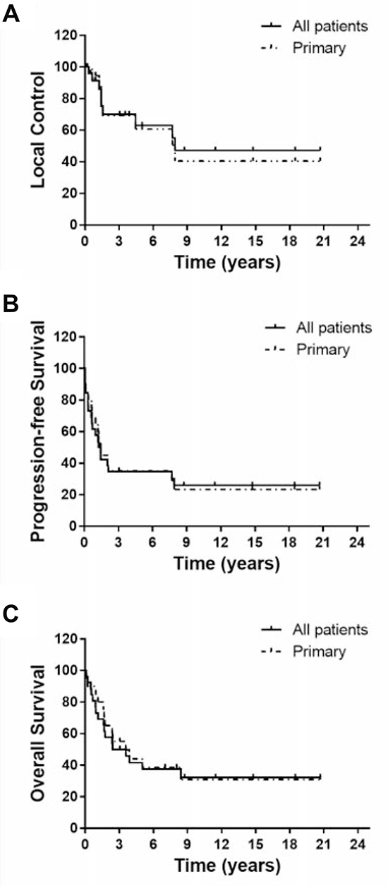 Figure 2: Kaplan–Meier curves of local control (A), progression-free survival (B) and overall survival (C) for all patients together (n = 26) or the 20 primary pelvic cases (not including metastatic, locally recurrent or radiation-induced cases).