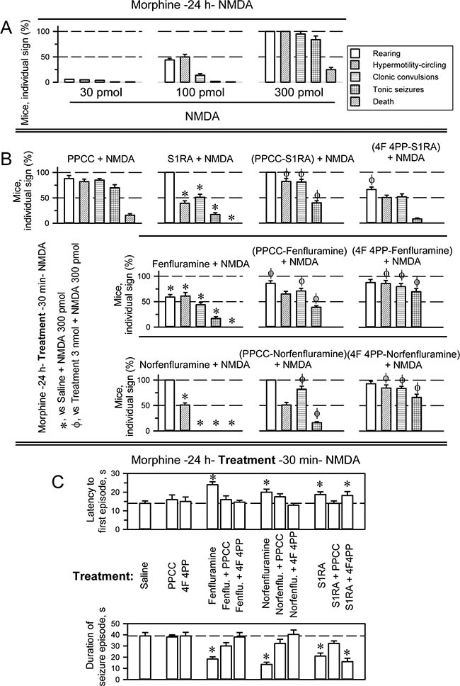 Figure 2: Anticonvulsant effect of fenfluramine and S1RA in a mouse model of seizures induced by NMDAR over activation. (A) Behavioral alterations produced by icv administration of NMDA to mice pretreated (–24 h) with the opioid agonist morphine (10 nmol, icv). (B) Effects of S1RA, fenfluramine and norfenfluramine (3 nmol each, icv) on seizures induced by NMDA (300 pmol, icv) in morphine-primed mice. The drugs were injected icv 30 min before the administration of the NMDA receptor agonist. *Significant difference from the control group, which received morphine and 24 h later NMDA, but saline instead of treatment; ϕ indicates that 3 nmol icv PPCC or 3 nmol icv 4F 4PP prevented the diminishing effects of S1RA/fenfluramine/norfenfluramine on the corresponding NMDA-induced behavioral sign. (C) Effects of the treatments on the latency and duration of the seizure episodes. *Significant difference from the control group receiving saline. ANOVA, Dunnett multiple comparisons vs control group, p < 0.05. (A–C) Each bar indicates the percentage of mice showing the indicated sign and represents the mean ± SEM of 9 mice.