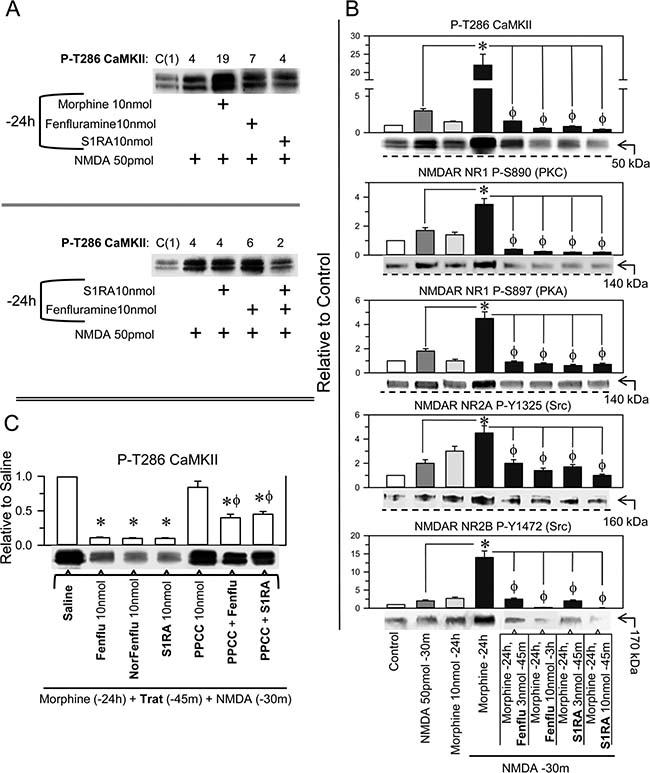 Figure 4: Effect of fenfluramine and S1RA on the overactivity of NMDARs promoted by NMDA in morphine-primed mice. (A) Morphine-primed mice exhibited a high level of CaMKII auto phosphorylation in response to NMDA. This effect was not evoked by fenfluramine or S1RA, which instead diminished P-T286 CaMKII levels in those morphine and NMDA-treated mice. The assay was repeated at least twice. The immunosignals are expressed relative to the control (C, value of 1), which received saline instead of the treatments indicated. (B) Effect of the different treatments on NMDAR phosphorylation and on P-T286 CaMKII. All substances were given icv, and the mice were killed at the post-drug intervals indicated, e.g., 30 min after NMDA and 24 h after morphine. The combined treatments started with morphine, and 24 h later, fenfluramine or S1RA was administered 45 m before NMDA. * Significant difference with respect to the group that received only morphine; ϕ significant difference respect to the morphine-primed group that received only NMDA 24 h later; ANOVA, Dunnett multiple comparisons vs control group, p < 0.05. (C) Effect of the σ1R agonist PPCC on the diminished effect of fenfluramine and S1RA on CaMKII hyper phosphorylation evoked by NMDA. The mice were primed with morphine, and 24 h later, the effects of the different drugs on P-T286 CaMKII were evaluated. *Significant difference with respect to the morphine-primed group that received saline instead of the drug and NMDA 24 h later; ϕ significant difference with respect to the group that received fenfluramine or S1RA but not PPCC; ANOVA, Dunnett multiple comparisons vs control group, p < 0.05. (A–C) Each bar represents the mean ± SEM of 6 mice. Details as in Figure 3 and Supplementary Figure 3.