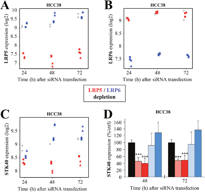 Figure 4: LRP5 regulates STK40 expression at the transcriptomic level. (A-C) HCC38 cells were transfected with one of two different siRNAs against LRP5 (#2: red square; #4, red triangle) or LRP6 (#7: blue square; #8, blue triangle) or with a control siRNA (gray circle). This experiment was performed in duplicate. Expression profiling was performed with Gene 2.1 Affymetrix chips, for HCC38 cells 24 h, 48 h and 72 h after transfection. (A-B) The expression of LRP5 (A) or LRP6 (B) was first checked in LRP5- and LRP6-depleted cells, to validate the experiment. (C) Microarray analysis revealed that STK40 RNA levels were lower specifically in LRP5-depleted HCC38 cells. (D) We confirmed, by RT-qPCR, that STK40 RNA levels were specifically lower in HCC38 cells depleted of LRP5. The data shown are means ± SD from three independent experiments. *P<0.05, **P<0.01, ***P<0.001 (i.e. a decrease relative to the control siRN A).