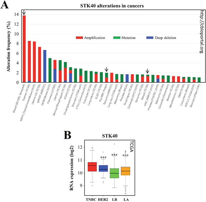 Figure 5: STK40 is amplified/mutated in various tumors and more strongly expressed in TNBC than in other subtypes of breast cancer. (A) We queried the cBio Cancer Genomics Portal (http://cbioportal.org) [54, 55] to determine whether STK40 was altered in various types of cancer. The graph imported from cbioportal shows the cancer types in which STK40 alterations (cutoff ≥ 1%) have been identified (green: mutation; blue: deletion; red: amplification). The arrows indicate the breast cancer studies where STK40 alterations were found. CAN: DNA copy number alteration, BCCRC: breast cancer patient xenografts; NEPC: neuroendocrine prostate cancer; MPNST: malignant peripheral nerve sheath tumor; DESM: desmoplastic melanoma; PCPG: pheochromocytoma and paraganglioma; CTCL: cutaneous T-cell lymphoma; DLBC: lymphoid neoplasm diffuse large B-cell lymphoma; MBC: metastatic breast cancer; HNC: head and neck cancer; GBM: glioblastoma multiforme; NSCLC: non-small cell lung cancer. (B) We analyzed STK40 expression in the various breast tumor subtypes of the TCGA cohort [80]. The values obtained for the relative quantification of RNA were log-transformed and are shown as box plots. Outliers are shown within each population studied (open circles). ***P<0.001 (comparisons with TNBC).
