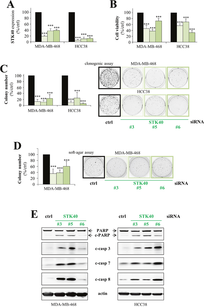 As LRP5 depletion downregulates STK40 and induces apoptosis, we hypothesized that the lower levels of STK40 might inhibit proliferation and lead to the induction of apoptosis following LRP5 knockdown. Three different STK40 siRNAs were used and, as expected, they all decreased STK40 RNA levels following the transfection of MDA-MB-468 and HCC38 cells (Figure 6A). STK40 depletion decreased cell viability (Figure 6B) and had an even stronger inhibitory effect on colony formation (Figure 6C). STK40 depletion also inhibited colony formation in a soft-agar assay in an anchorage-independent manner (Figure 6D). Like LRP5 depletion (Figure 3), STK40 depletion induced apoptosis, with the activation of caspases 3, 7 and 8, and the cleavage of PARP (Figure 6E).